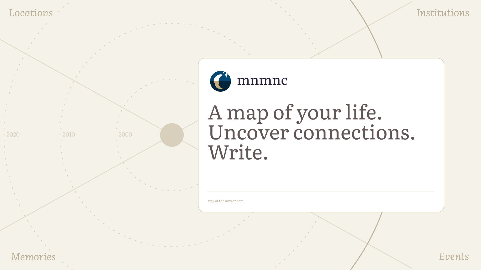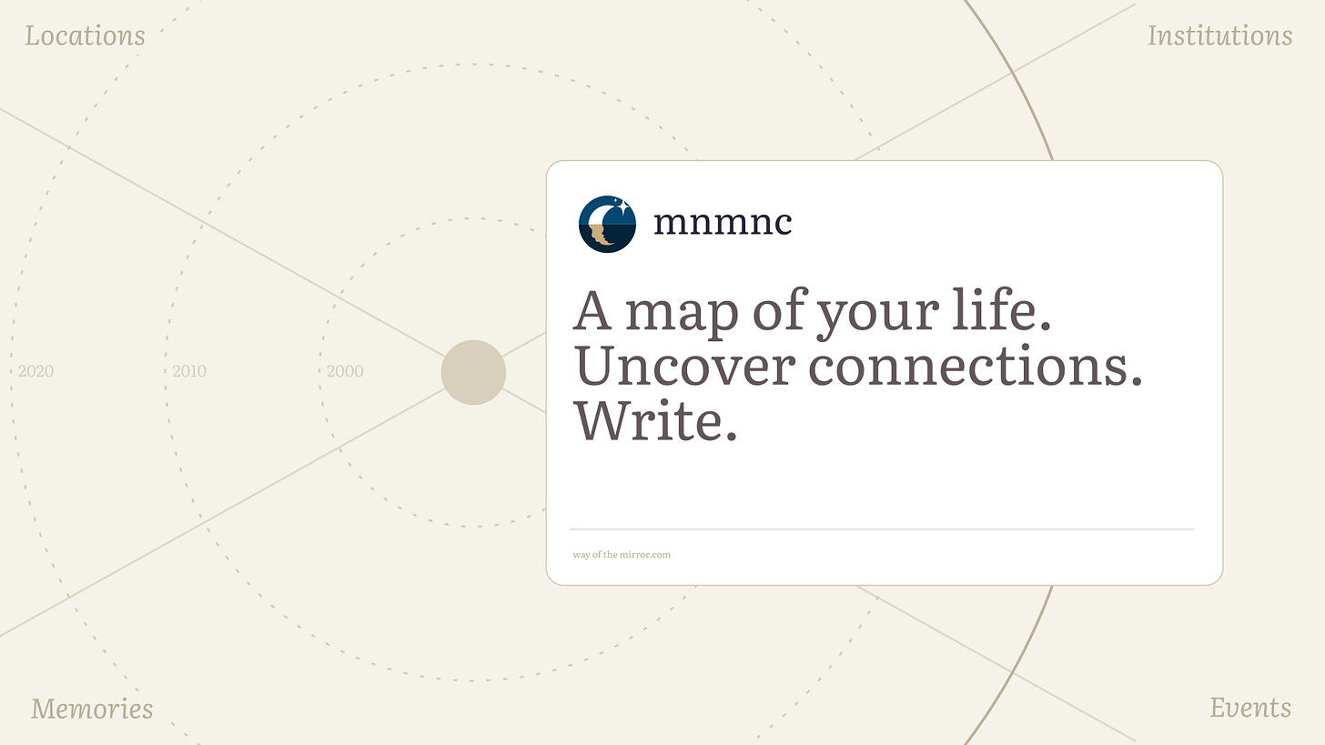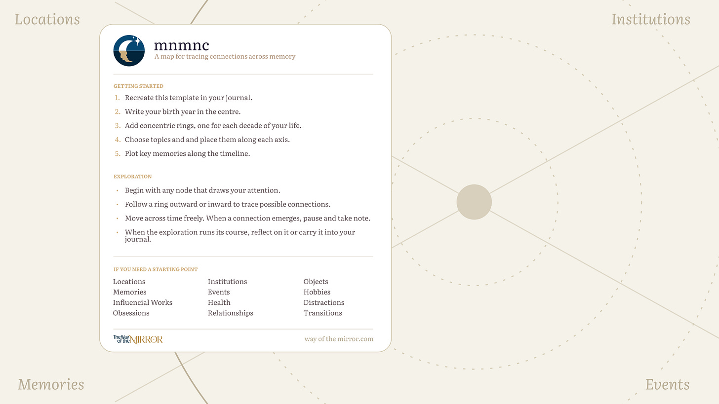 A single memory holds little meaning on its own. Coherence emerges in the space between. This simple spread helps me remember. I ended up shortening it to mnmnc.